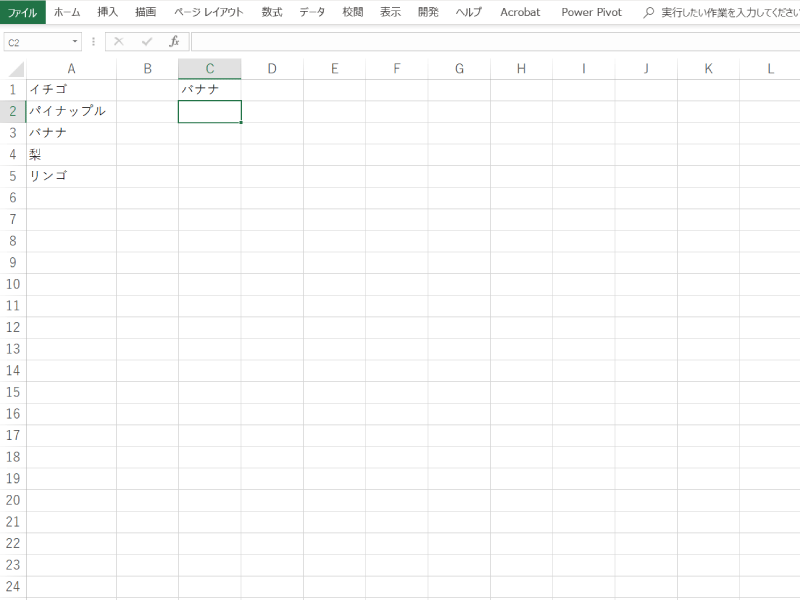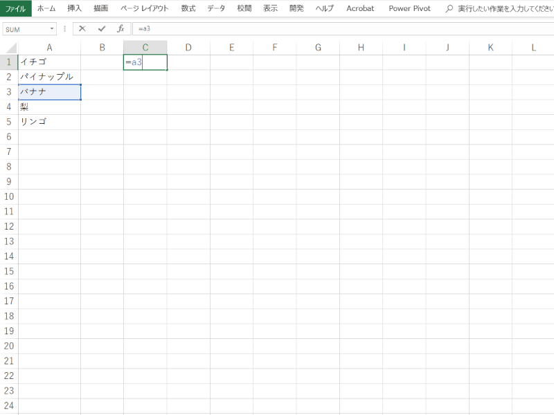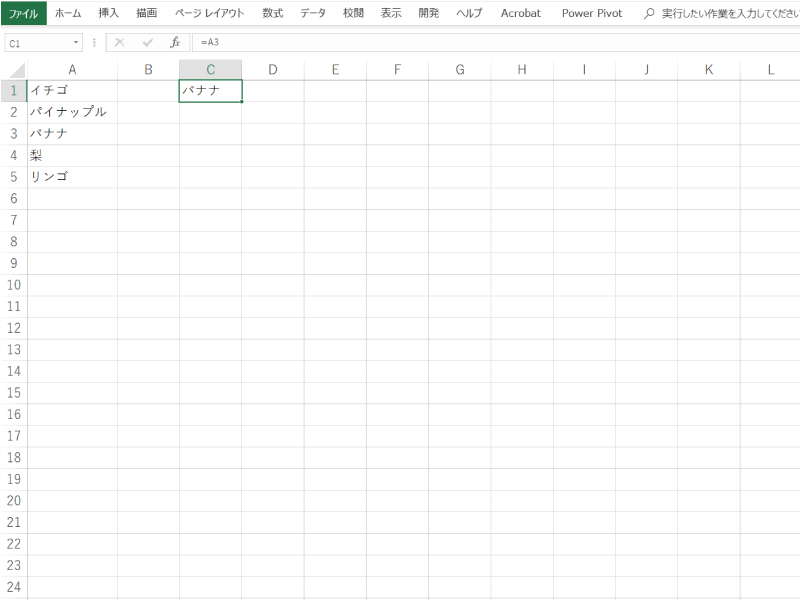 セル「C1」に、セル「A3」のバナナを参照する場合、やり方は