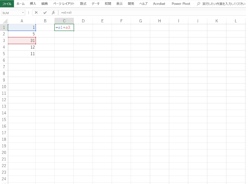 セル「A1」の(1)とセル「A3」の(31)を加算した(32)が表示されました。